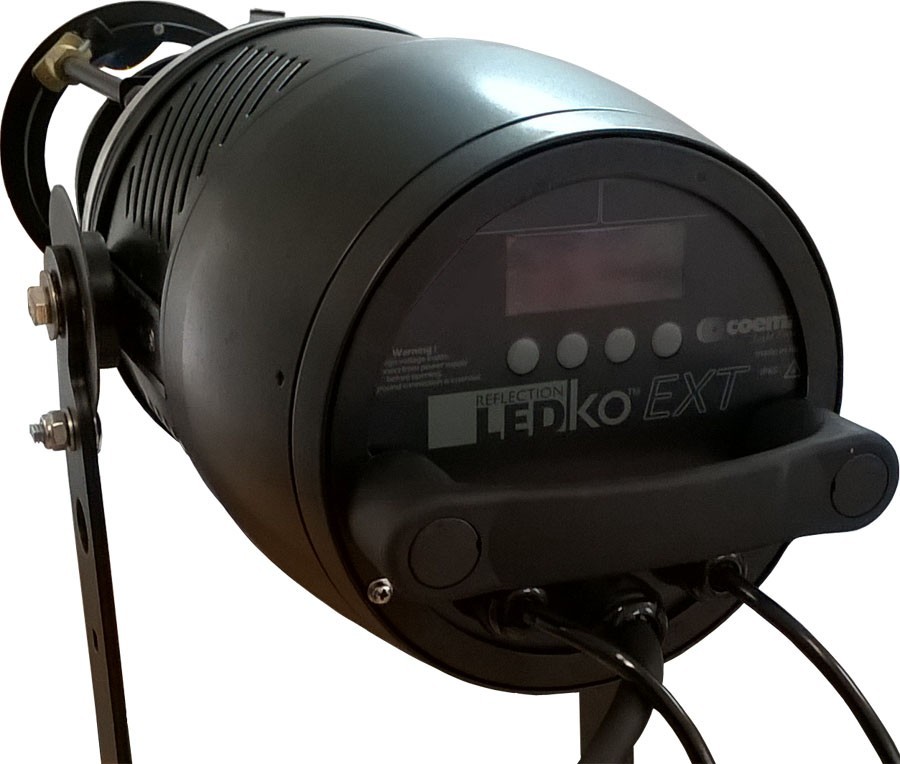 IP65 Outdoor Zoom (26°-40°) Profilscheinwerfer basierend auf der LEDko Serie. Die Lösung, um Firmenlogos zu projezieren, bei Open Air Veranstaltungen jeder Art oder für die Architekturbeleuchtung. Bei Coemar kommen modellspezifisch Weißlichtarrays oder RGBAL-Einheiten zum Einsatz. Damit ist der LEDko in der Lichtleistung gegenüber anderen etablierten Herstellern teils überlegen, bei einem attraktiveren Preis. Auch treten bei dem Weisslichtarray keine Farbschatten oder Multiquellenschatten auf. Den LEDko EXT gibt es in den Varianten FullSpektrum (RGBAL) sowie als Daylight (CRI 90 oder CRI 80) und Tungsten (CRI 90 oder CRI 80). Zusätzlich hat man die Wahl zwischen der Variante Engine (nur Leuchtenkopf ohne Optik), Basic und mit einem festen Gobohalter oder zwei rotierenden Goborädern. Bei diesem Modell können beide Gobos zur gleichen Zeit via DMX gesteuert werden, was dynamische Effekte wie z.B. Wasser, Feuer oder Regen möglich macht.