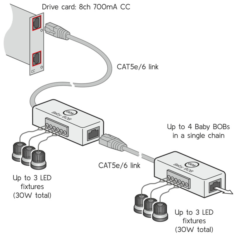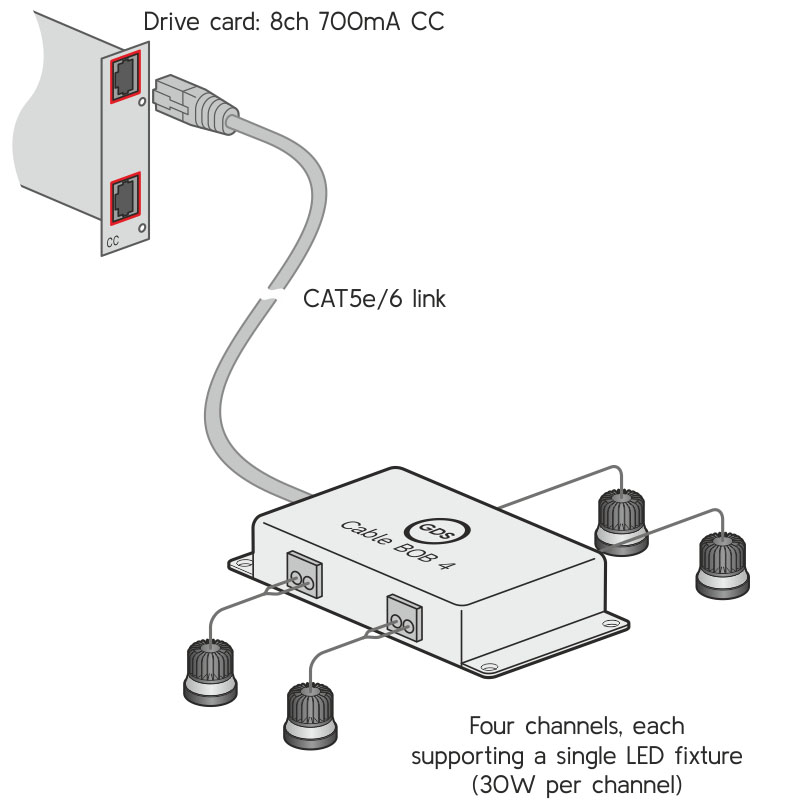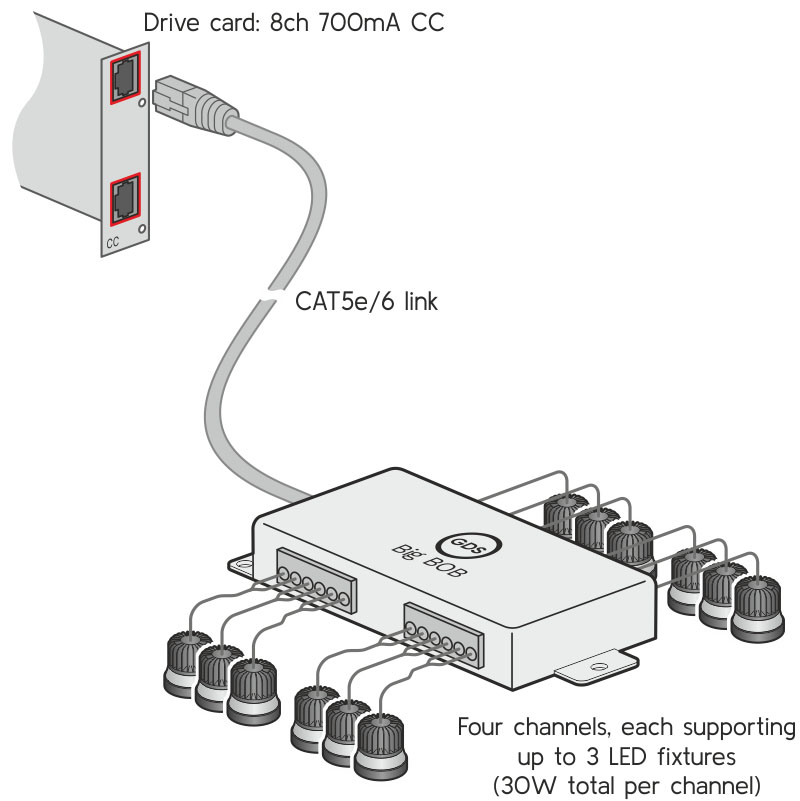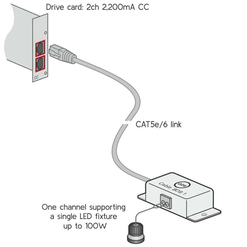 Break Out Boxen sind nützliche Hilfskomponenten, die mehrere Kanäle von jeder Konstantstrom-Treiberkarte über Standard-Datenkabel an die richtige Leuchte verteilen. Es ist eine Vielzahl von Break Out Boxen erhältlich, um Anwendungsanforderungen zu erfüllen.