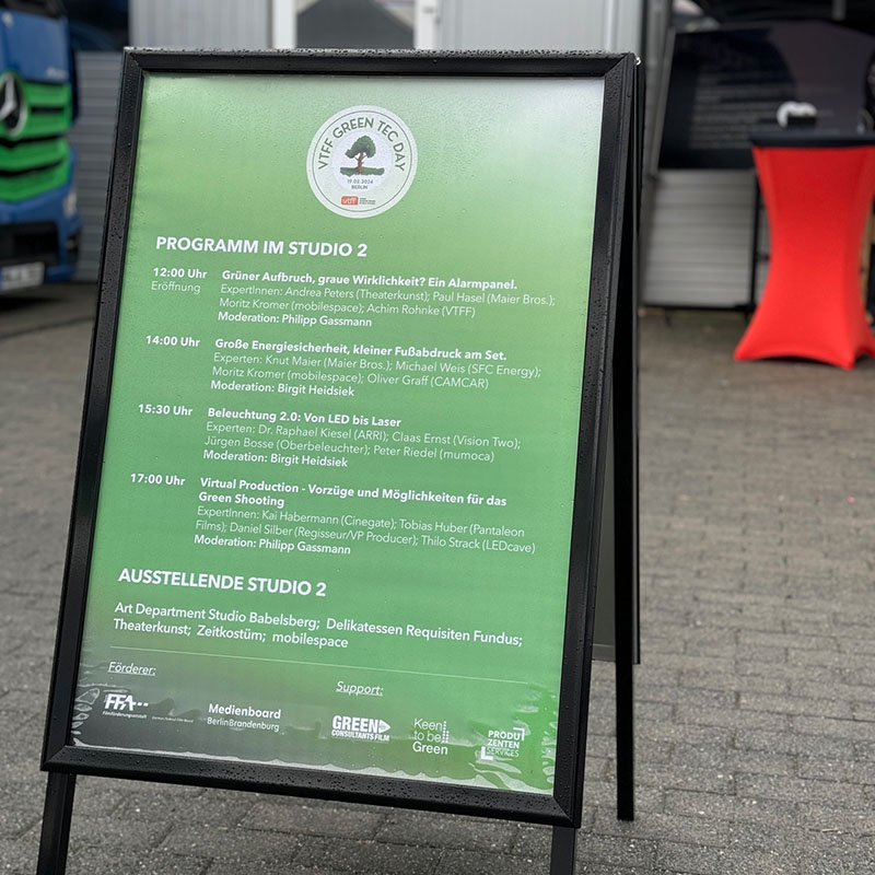 Am 19. Februar fand der 2. Green Tec Day des VTFF (Verband Technischer Betriebe für Film und Fernsehen e.V.) im Rahmen der Berlinale in den Cinegate Studios statt, bei dem neue Technologien und innovative Lösungen vorgestellt wurden, mit denen sich Filme umweltschonender produzieren lassen.