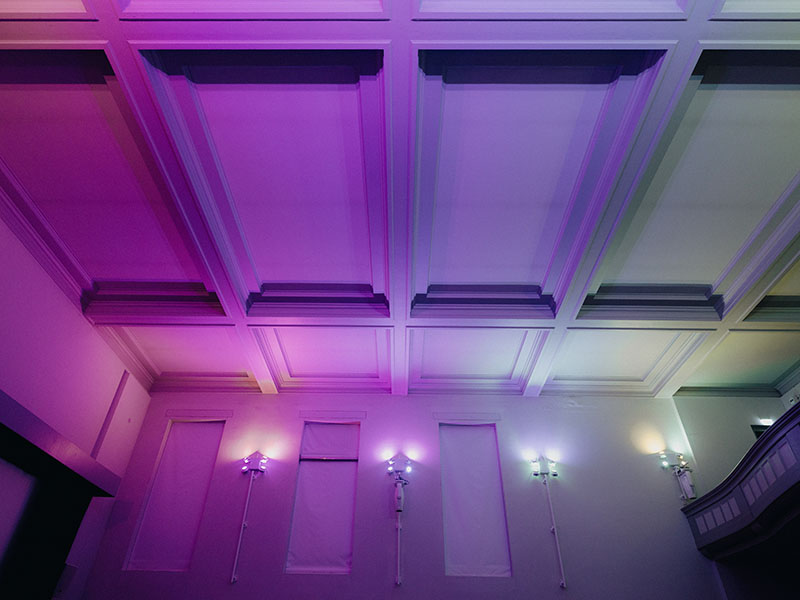 Als Deckenbeleuchtung kamen 32 GDS Sirius Leuchten mit IPM2-Technologie zum Einsatz. Diese leistungsstarken RGB-Leuchten überzeugen durch hohe Farbtreue, flexible Farbtemperaturen und vielseitige Optiken. Unterschiedliche Abstrahlwinkel – von Cyc- bis Spot-Optiken – ermöglichen eine gleichmäßige Ausleuchtung der Kassettendecke. Darüber hinaus eröffnet die Einzelansteuerung jeder Leuchte neue gestalterische Möglichkeiten: Von dezenten Weißlichtszenarien bis hin zu farbigen Inszenierungen, etwa für Veranstaltungen oder wissenschaftliche Visualisierungen wie Gewitterstimmungen oder Nachthimmelprojektionen.
