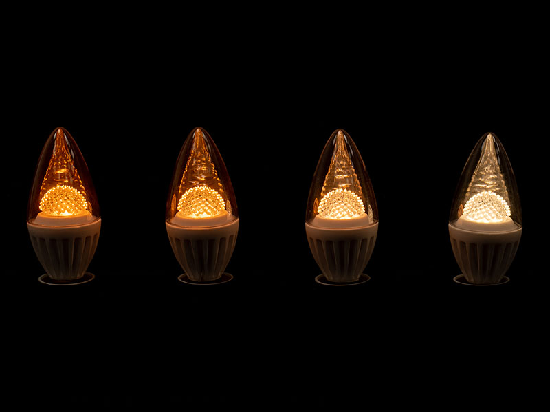 Zentraler Bestandteil der Installation sind die GDS Lamps in Kerzenform mit klarem Glaskörper und E14-Sockel. Mit 490 Lumen bei lediglich 4,2 Watt ersetzen sie klassische 28 Watt Halogenleuchten und erzeugen durch ihre spezielle Optik eine homogene Lichtverteilung mit überzeugendem Kerzencharakter. Entscheidendes Merkmal ist das Fade-to-Warm-Verhalten, bei dem sich die Farbtemperatur beim Dimmen vom warmweißen Ausgangswert von 3.000K in den deutlich wärmeren glühlampenähnlichen Bereich von 1800K verschiebt.