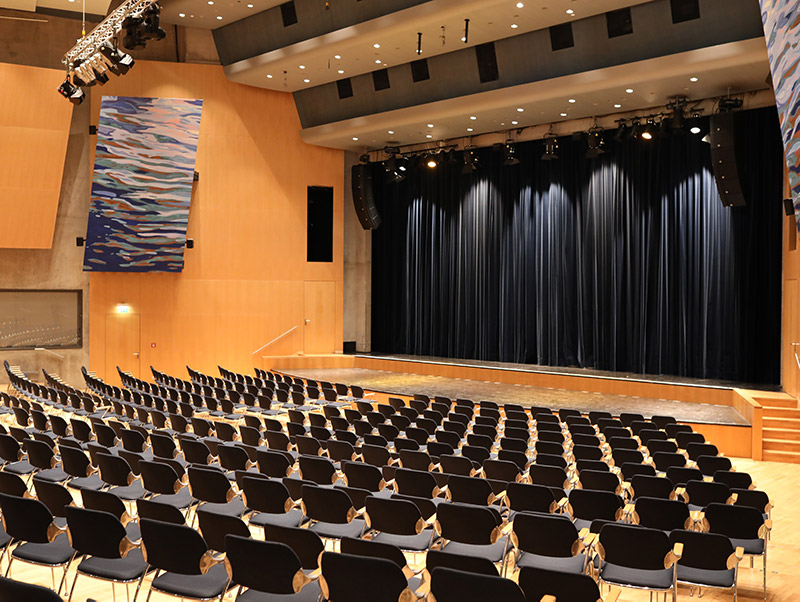 Zusätzlich zu der Saalbeleuchtung und den damit verbundenen zentralisierten LED Dimmern, welche perfektes Dimmen auf 0% über die Bestandsverkabelung ermöglichen, haben wir 18 sonderangefertigte Pendelleuchten von GDS für das Foyer geliefert, welche nach den Wünschen der Auftraggeber designt wurden.