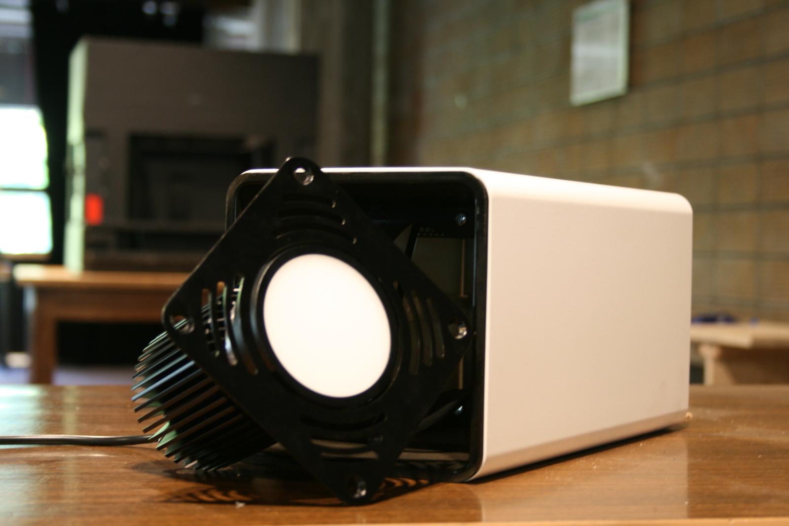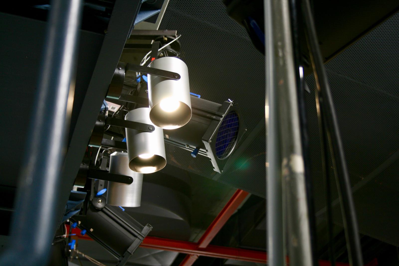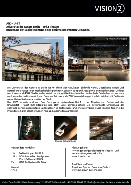 Dazu wurden für Saal- und Bühnenbeleuchtung 14 DeSisti SuperLED F7 T (Tungsten) LED Fresnel Scheinwerfer montiert. Das Uni.T ist mit dieser hochmodernen Ausrüstung gleichzeitig das weltweit erste Projekt, indem der neue GDS ArcSystem DX Driver verbaut wurde.